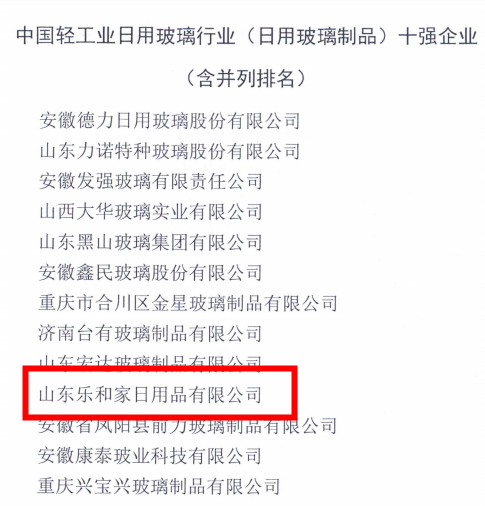 不忘初心,砥礪前行。在不久前結束的中國輕工業聯合會組織開展的2022年度 “ 中國輕工業行業十強企業 ” 統計評價工作中,山東樂和家日用品有限公司榮獲中國輕工業日用玻璃行業 (日用玻璃制品) 十強企業。